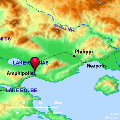 Atlas ![]() Amphipolis and surrounding area Maps Created using Biblemapper 3.0 Additional data from OpenBible.info You are free to use up to 50 Biblos coprighted maps (small or large) for your website or presentation. Please credit Biblos.com. Occurrences Acts 17:1 Now when they had passed through Amphipolis and Apollonia, they came to Thessalonica, where there was a Jewish synagogue.Encyclopedia AMPHIPOLISam-fip'-o-lis (Amphipolis): A town in Macedonia, situated on the eastern bank of the Strymon (modern Struma or Karasu) some three miles from its mouth, near the point where it flows out of Lake Prasias or Cercinitis. It lay on a terraced hill, protected on the North, West and South by the river, on the East by a wall (Thuc. iv.102), while its harbor-town of Eion lay on the coast close to the river's mouth. The name is derived either from its being nearly surrounded by the stream or from its being conspicuous on every side, a fact to which Thucydides draws attention (in the place cited). It was at first called Ennea Hodoi, Nine Ways, a name which suggests its importance both strategically and commercially. It guarded the main route from Thrace into Macedonia and later became an important station on the Via Egnatia, the great Roman road from Dyrrhachium on the Adriatic to the Hebrus (Maritza), and it was the center of a fertile district producing wine, oil, figs and timber in abundance and enriched by gold and silver mines and considerable manufactures, especially of woolen stuffs. In 497 B.C. Aristagoras, ex-despot of Miletus, tried to settle there, and a second vain attempt was made in 465-464 by the Athenians, who succeeded in founding a colony there in 437 under the leadership of Hagnon. The population, however, was too mixed to allow of strong Athenian sympathies, and in 424 the town fell away to the Spartan leader Brasidas and defied all the subsequent attempts of the Athenians to recover it. It passed under the protectorate of Perdiccas and Philip of Macedon, and the latter finally made himself master of it in 358. On the Roman partition of Macedonia after the battle of Pydna (168 B.C.) Amphipolis was made a free city and capital of Macedonia Prima. Paul and Silas passed through it on their way from Philippi to Thessalonica, but the narrative seems to preclude a long stay (Acts 17:1). The place was called Popolia in the Middle Ages, while in modern times the village of Neochori (Turkish, Yenikeui) marks the site (Leake, Northern Greece, III, 181, Cousinery, Macedoine, I, 100, 122; Heuzey et Daumet, Mission archeol. de Macedoine, 165). AMPHIP'OLIS, the name occurs only in Acts 17:1. In the Apostle's time it was a chief city, under the Romans and in the s. part of Macedonia. The river Strymon curved around it in a semicircle on the w. so as to be on both sides of the city, hence the name alludes to the river as around, amphi,' the city, polis.' From this city w. to Thessalonica was 48 ms.; it was 29 ms. s.w. from Philippi in a straight line; 23 1/2 ms. to Apollonia and from Apollonia to Thessalonica 29 1/2 ms. But in the Peutinger Tables (see the Preface for these) it is laid down as 33 ms. from Philippi to Amphipolis and from Amphipolis to Apollonia, 30 ms., thence to Thessalonica, 37 ms., these measurements, probably, being along the windings of the road. It is now only ruins, the new village being on the n.e. Strong's Greek G295: AmphipolisAmphipolis, a city in Macedonia |