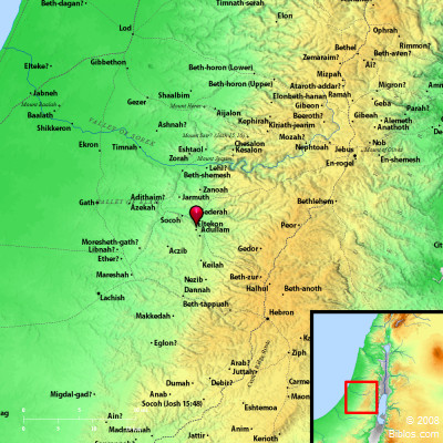 Atlas ![]() Eltekon and surrounding region Maps Created using Biblemapper 3.0 Additional data from OpenBible.info You are free to use up to 50 Biblos coprighted maps (small or large) for your website or presentation. Please credit Biblos.com. Occurrences Joshua 15:59 Maarath, Beth Anoth, and Eltekon; six cities with their villages.Encyclopedia ELTEKONel'-te-kon ('elteqon, "founded by God"): Strong's Hebrew H515: Elteqona city in Palestine |