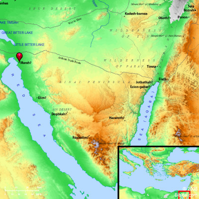 Atlas ![]() Marah and surrounding region Maps Created using Biblemapper 3.0 Additional data from OpenBible.info You are free to use up to 50 Biblos coprighted maps (small or large) for your website or presentation. Please credit Biblos.com. Occurrences Exodus 15:23 When they came to Marah, they couldn't drink from the waters of Marah, for they were bitter. Therefore its name was called Marah.Numbers 33:8 They traveled from before Hahiroth, and passed through the midst of the sea into the wilderness: and they went three days' journey in the wilderness of Etham, and encamped in Marah. Numbers 33:9 They traveled from Marah, and came to Elim: and in Elim were twelve springs of water, and seventy palm trees; and they encamped there. Encyclopedia MARAHma'-ra, mar'-a (marah, "bitter"): The first camp of the Israelites after the passage of the Red Sea (Exodus 15:23 Numbers 33:8 f). The name is derived from the bitterness of the brackish water. Moses cast a tree into the waters which were thus made sweet (Exodus 15:23). Strong's Hebrew H4785: Maraha bitter spring in the Sinai peninsula |